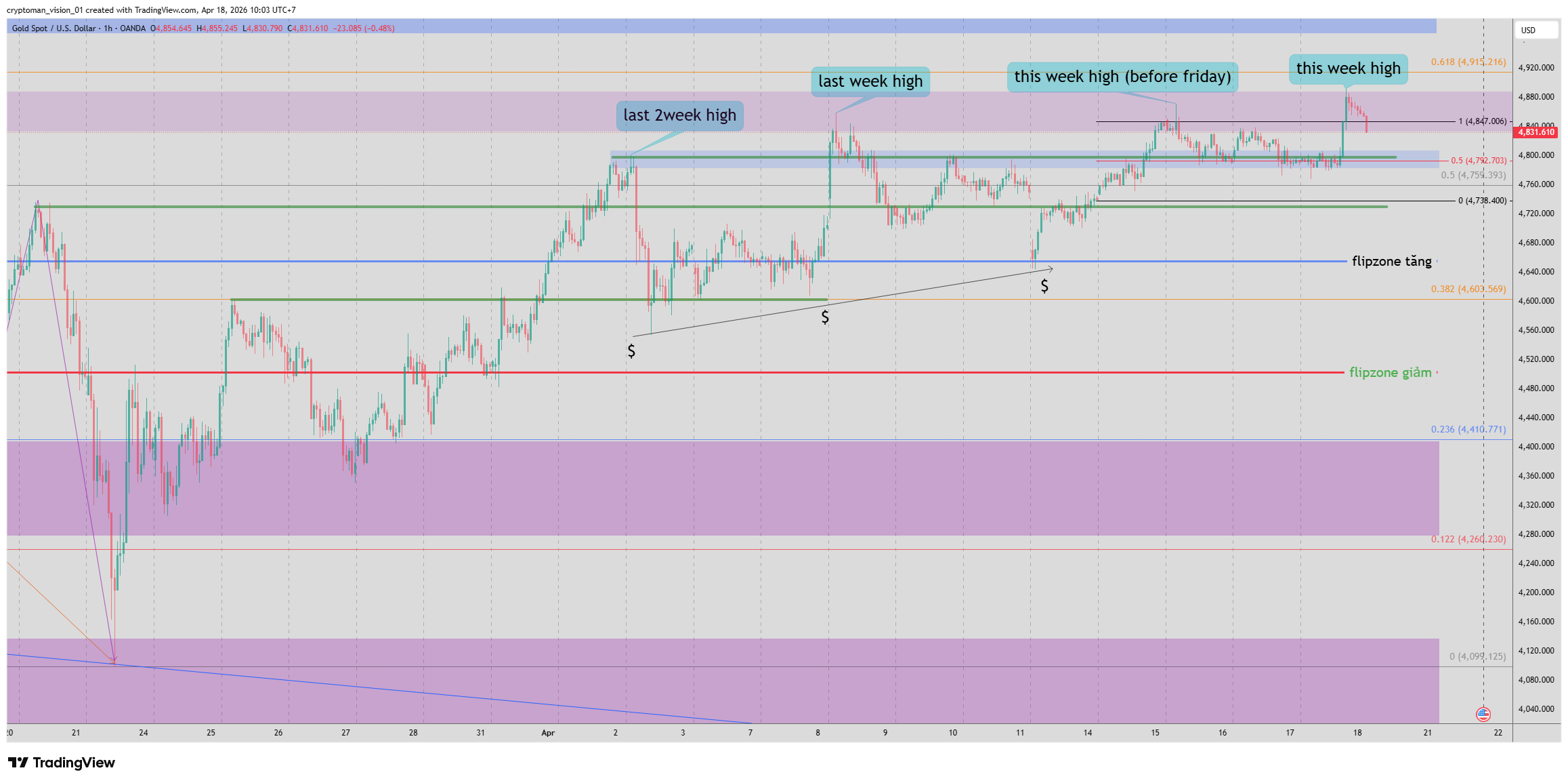 Giá đã 3 lần cố gắng xuyên phá lên khỏi flipzone mà chưa thành công và mỗi lần giá chạm đều bị xả mạnh => tranh chấp mạnh trong 2 tuần gần đây